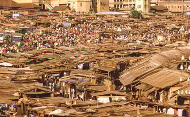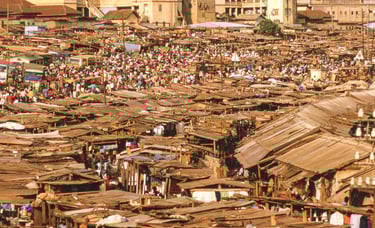 1983 - voyage au Ghana et découverte du continent Africain. Kumasi, fascinante capitale de l'empire Ashanti accueille le plus grand marché d'Afrique de l'Ouest. Des kilomètres de commerces sous la tôle ondulée parcourus par des milliers de personnes sans trêve du lever au coucher du soleil. Malgré le risque d'expulsion du pays en bravant l'interdiction de photographier, j'ai pu capturer des images de cette ancienne colonie Britannique, haut lieu du commerce d'esclaves.